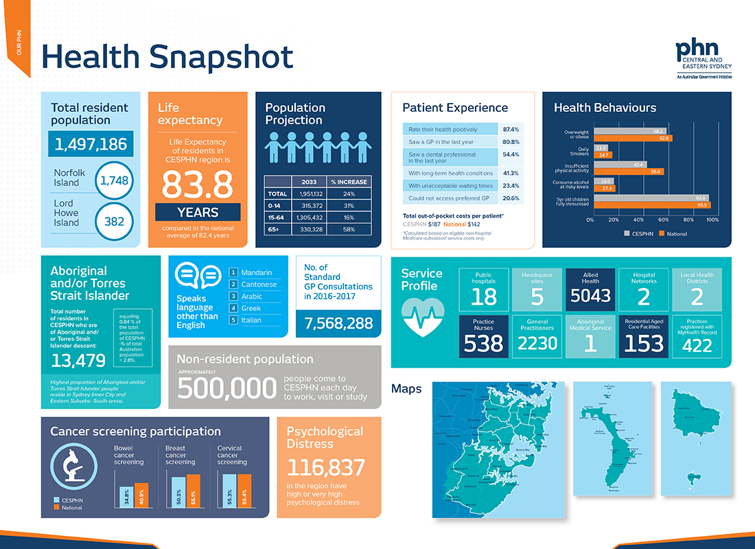 Central and Eastern Sydney PHN have been established with the key objectives of increasing the efficiency and effectiveness of medical services for individuals, particularly those at risk of poor health outcomes. They also aim to improve coordination of care to ensure people receive the right care in the right place at the right time.
